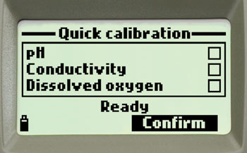 Fonction Quick Calibration – Quick Calibration fournit un étalonnage rapide en un seul point pour le pH, la conductivité et l'oxygène dissous. Des options d'étalonnage standard sont disponibles, notamment le pH jusqu'à trois points, la conductivité en un point et l'oxygène dissous jusqu'à deux points.